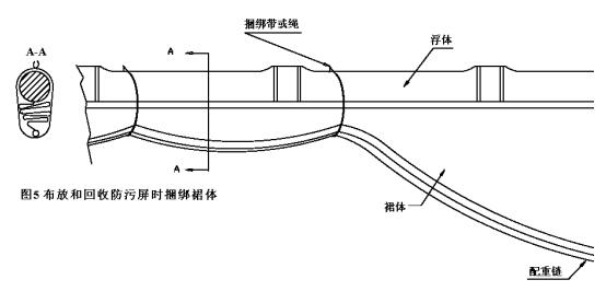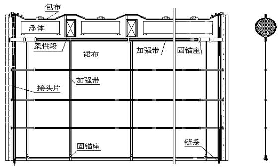 由包布和裙體組成,包布為PVC雙面涂覆增強(qiáng)塑料布。浮體為聚苯乙烯泡沫用耐油塑料膜密封,浮子間的間距形成柔性段保證防污屏的可折疊性和乘波性,裙體的下端包有鏈條。防污屏漂在水中,浮子及包布的上中部形成水面以上部分,裙體由配重鏈保持垂直穩(wěn)定性,形成水下部分。脊繩、加強(qiáng)帶和配重鏈為縱向受力元件。有數(shù)個(gè)浮子組成的防污屏節(jié)一般是20米長(zhǎng),節(jié)間用接頭連接。防污屏兩端及中間有固錨座便于布放防污屏?xí)r聯(lián)接錨繩用。