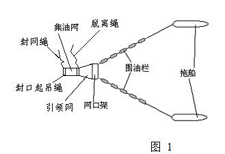 收油網(wǎng)由兩條固體浮子圍油欄、 網(wǎng)口架、引領(lǐng)網(wǎng)和集油網(wǎng)構(gòu)成(見圖1)。一般每條圍油欄長10m,圍油欄一端為拖頭,便于拖帶,另一端可與網(wǎng)口架前端快速連接。集油網(wǎng)前端與網(wǎng)口架連接,集油網(wǎng)后端在收油時封死,但可以敞開便于將網(wǎng)中油泄出。