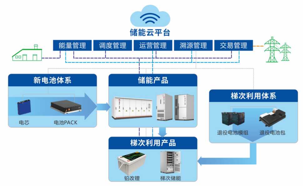 構(gòu)建“三款產(chǎn)品、兩套體系、一個(gè)平臺”業(yè)態(tài),不斷攻克儲能與梯次利用關(guān)鍵技術(shù),實(shí)現(xiàn)儲能產(chǎn)品全生命周期數(shù)字化管理,建設(shè)從電池—梯次利用—電池材料的低碳循環(huán)產(chǎn)業(yè)鏈。